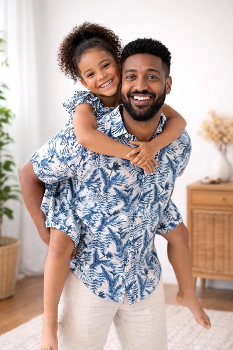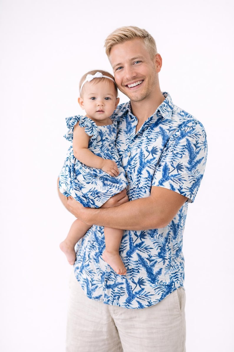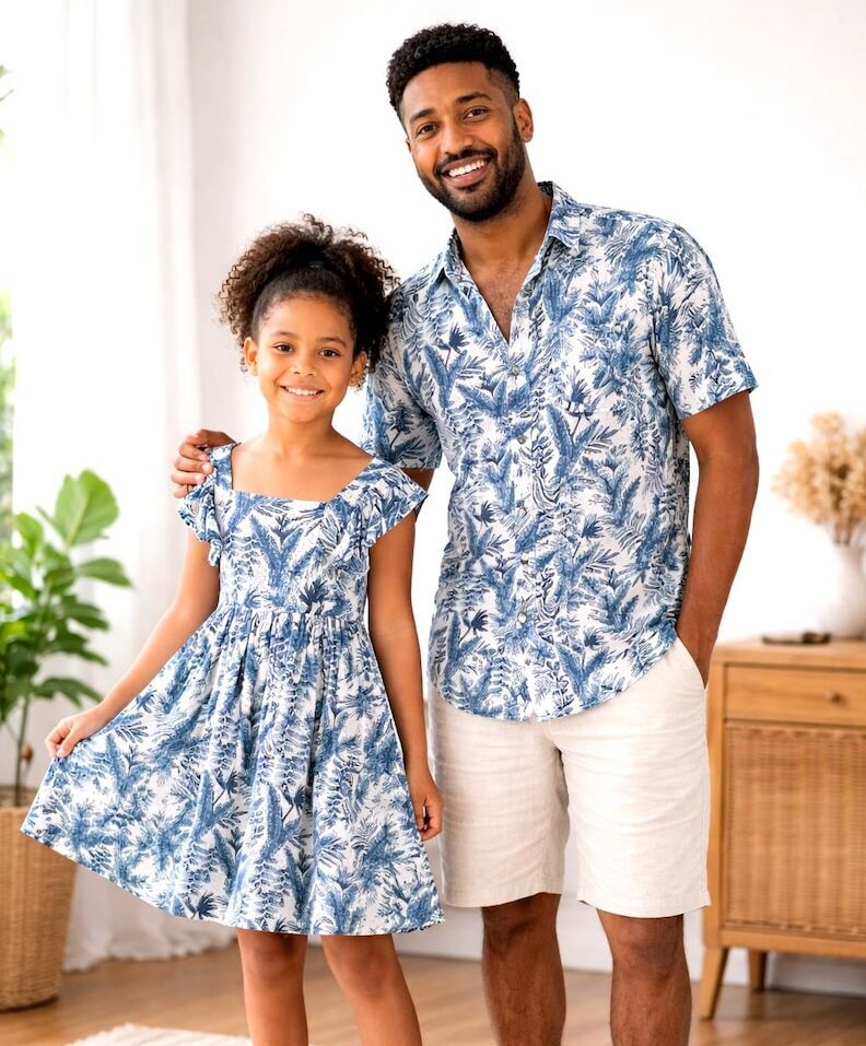 Now Dad can match his little one in thes amazing Father and Daughter matching Tropical leaf Button up Shirt and Dresses.