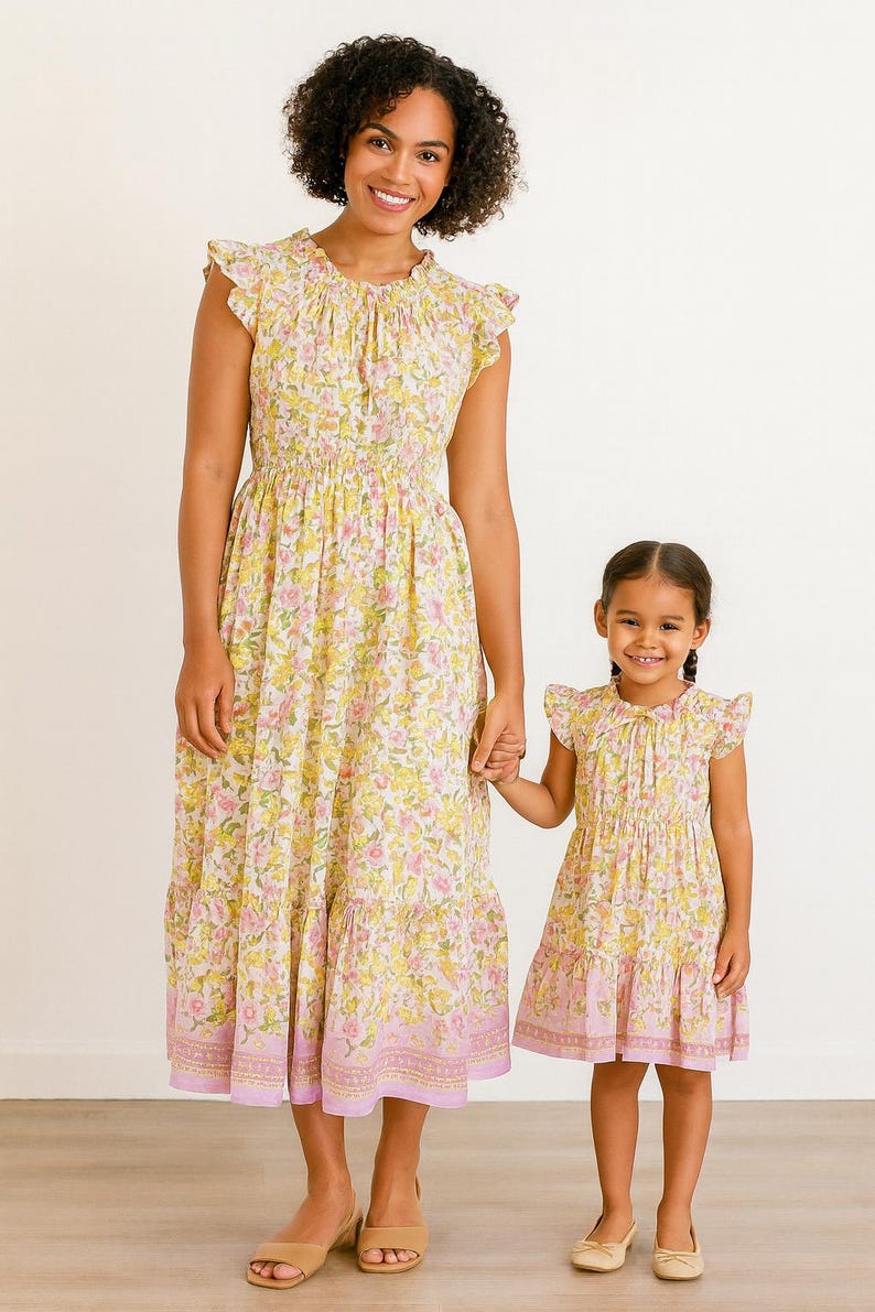 These Mommy and Me long dresses are made from soft rayon with a bright yellow floral print. Designed with a lightweight drape, they’re perfect for warm days and comfortable enough for all-day wear.